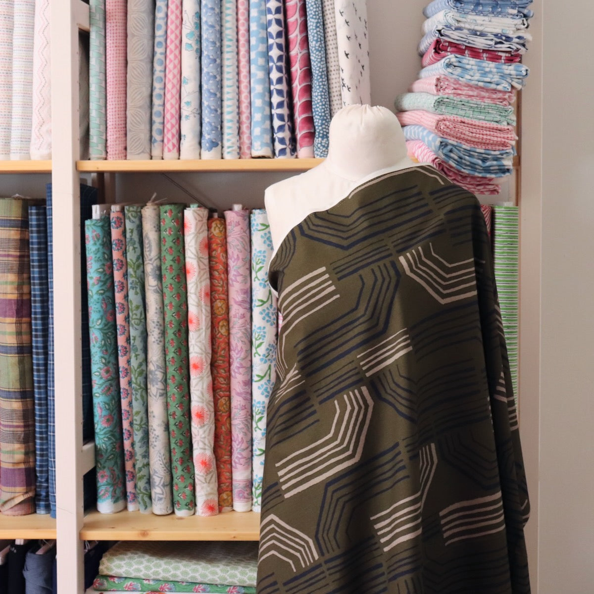 A touch of Art Deco-style for your winter wardrobe. With a barely brushed surface, this broadcloth is soft to the touch yet slightly crisp. Deep olive green with navy and oyster-colored lines. In a light mid-weight, perfect for cool-weather shirts or pleated skirts or dresses.