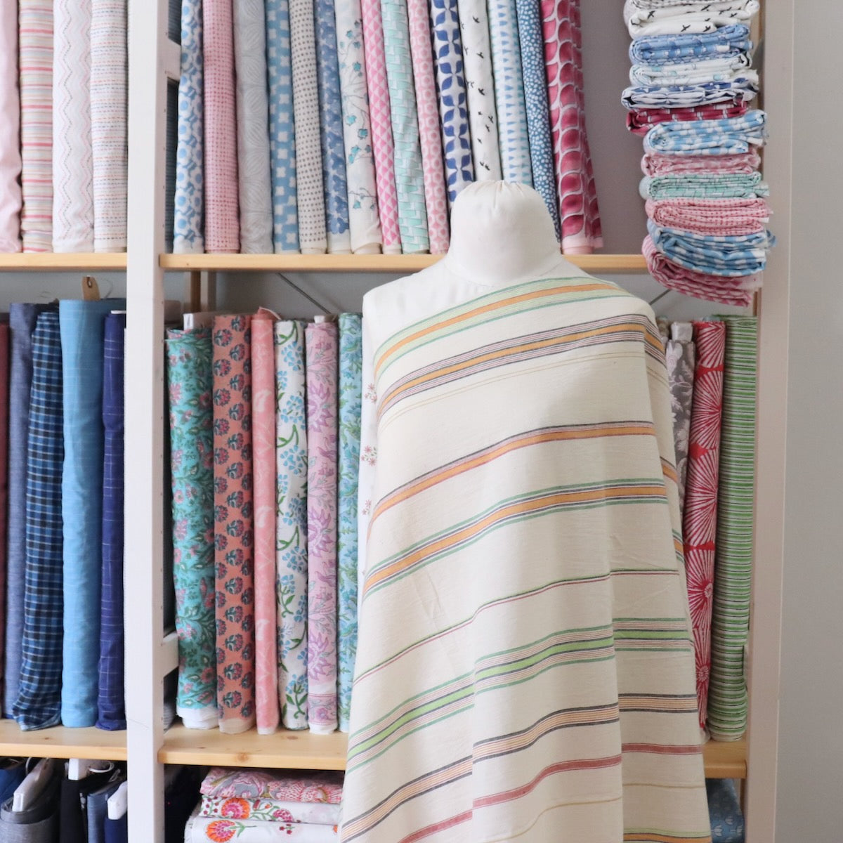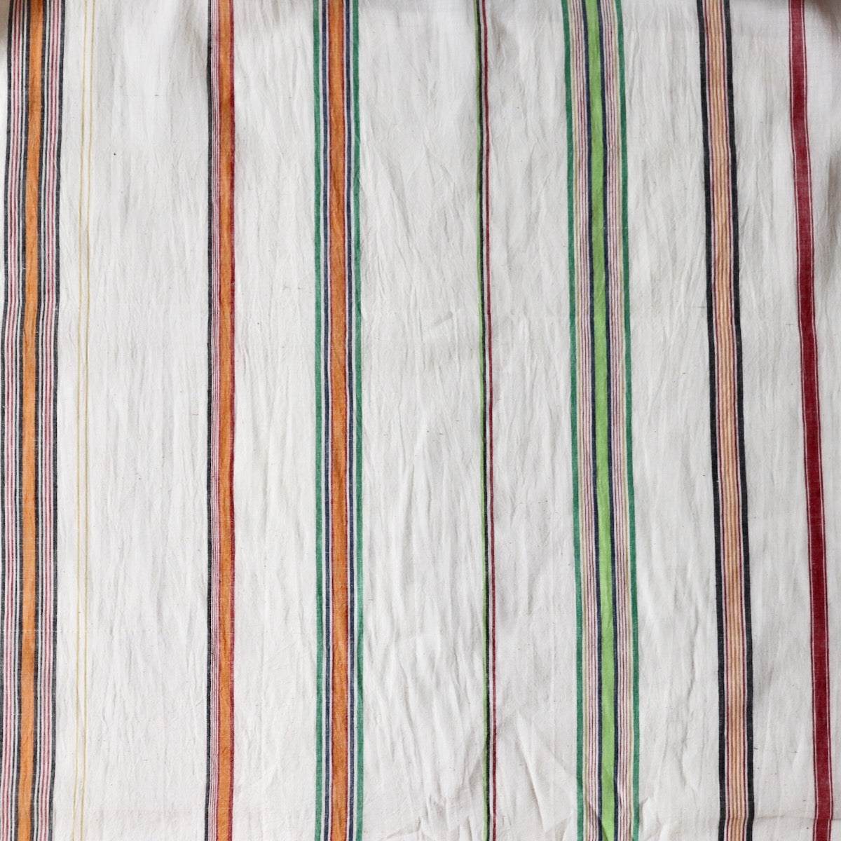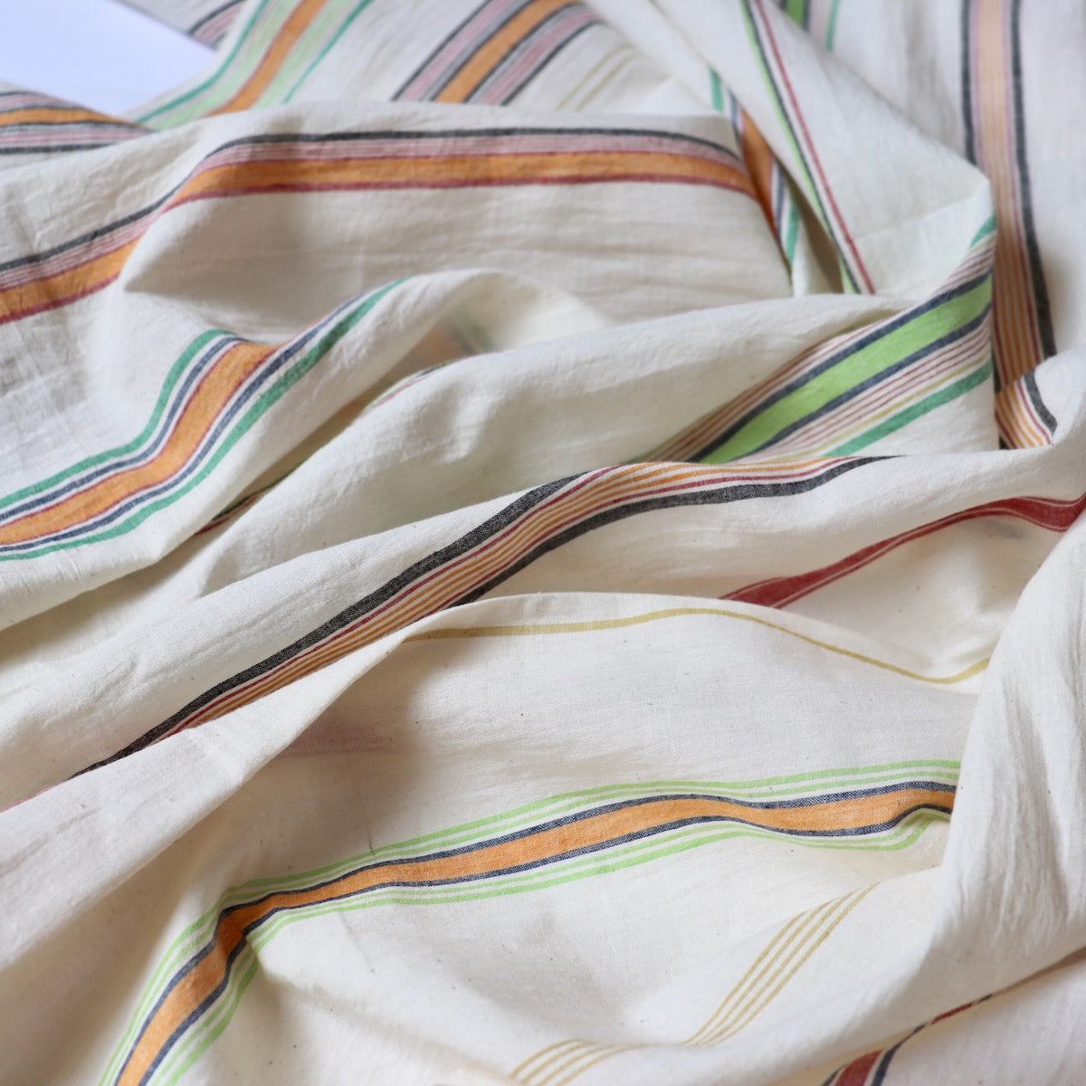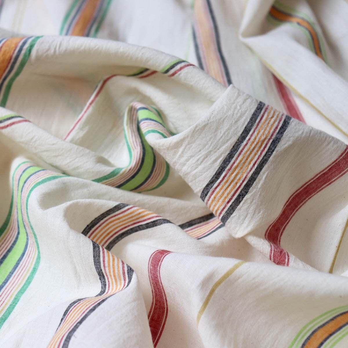 A random assortment of fun, colorful stripes on handloom cotton. This slightly translucent light shirting weight has a warm, unbleached off-white color. Sew something that will make the most of the stripes, like the Judy Top from Notches Patterns. (Skirts or dresses may need to be lined.) Stripes are parallel to the selvedges. Wider stripe sets are about 1.5 inches wide.