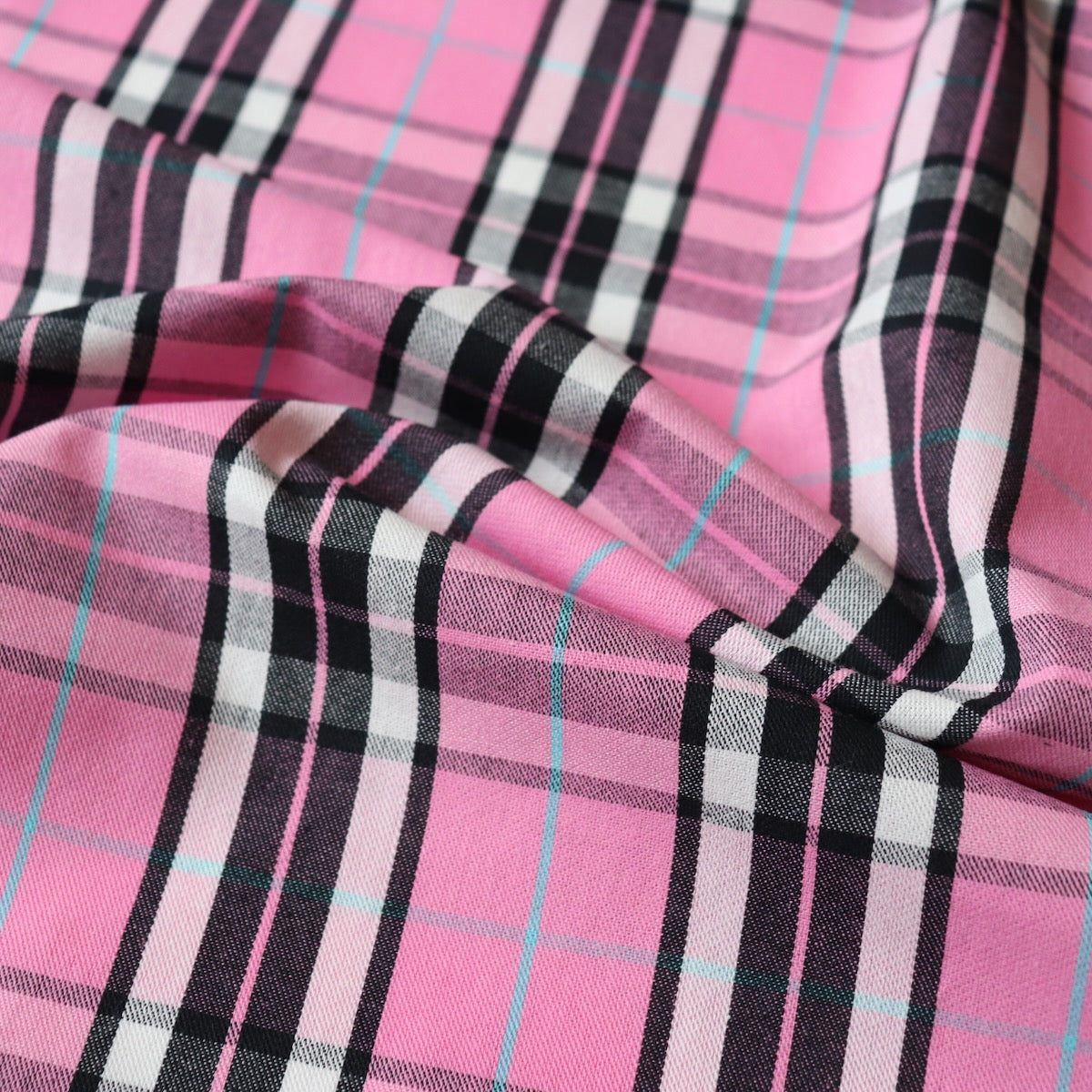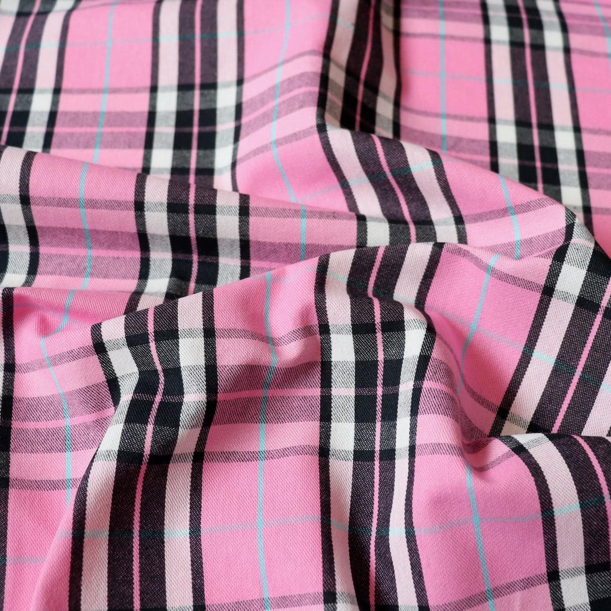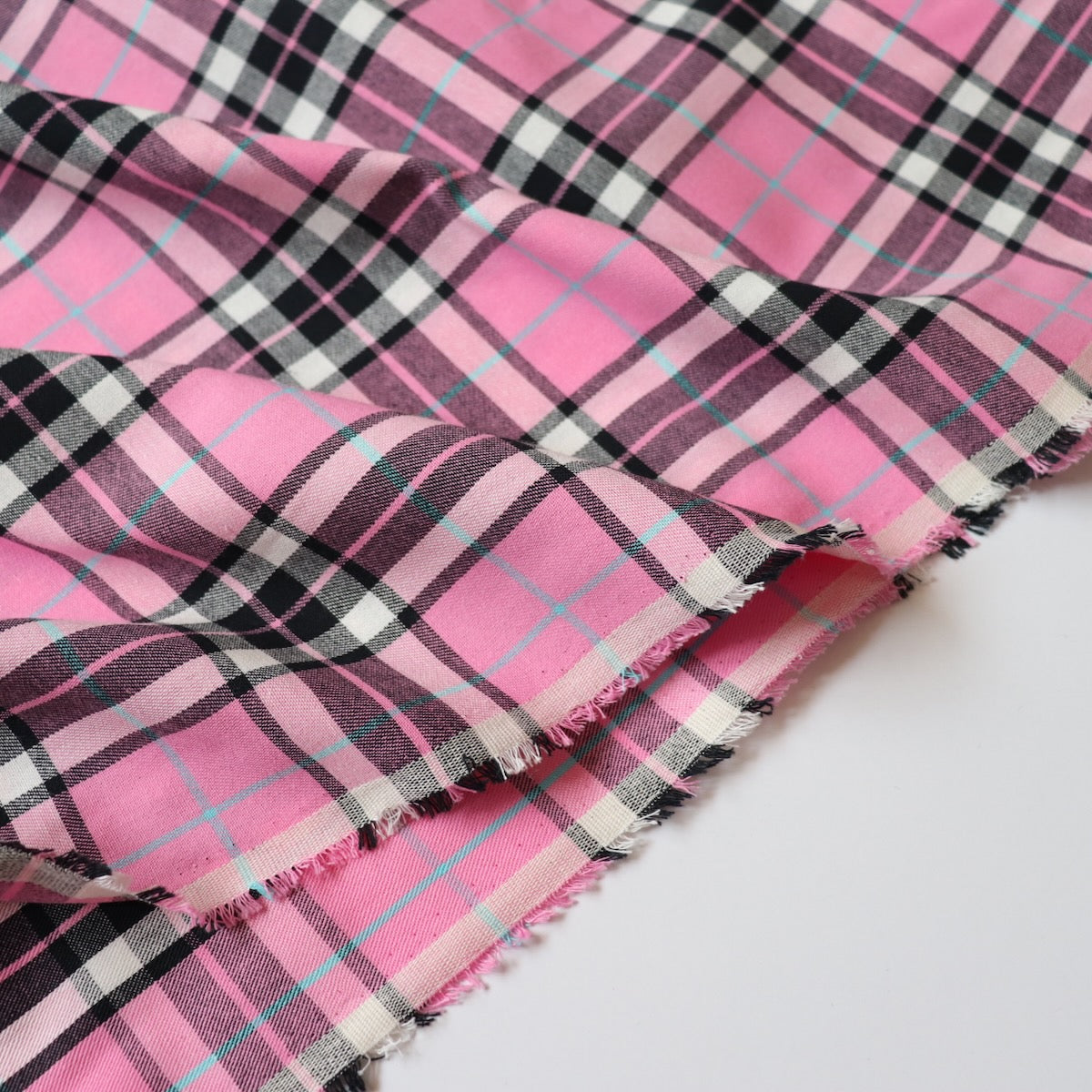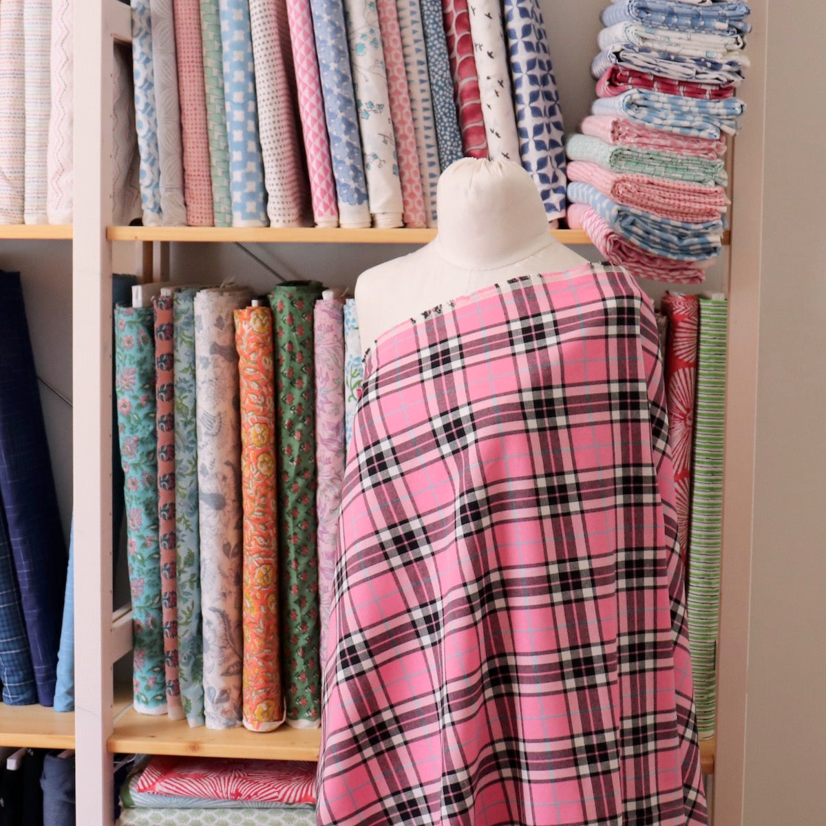 Autumn calls for colorful plaids. Bright pink with a blue overcheck, this is a yarn-dyed cotton twill. Lighter mid-weight and slightly crisp with a dry touch. Make a structured shirt or dress, trousers, or a soft jacket like the Kusuma Jacket pattern from Sew Different. The repeat measures about 3.5 x 4 inches.