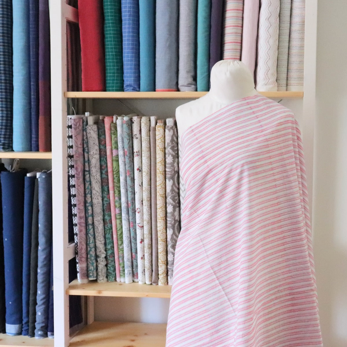 Delightful peppermint pink stripes, and a bit of blue, on soft white cotton. We love the artisanal touch of the overlapping blocks — after all, it is hand printed!