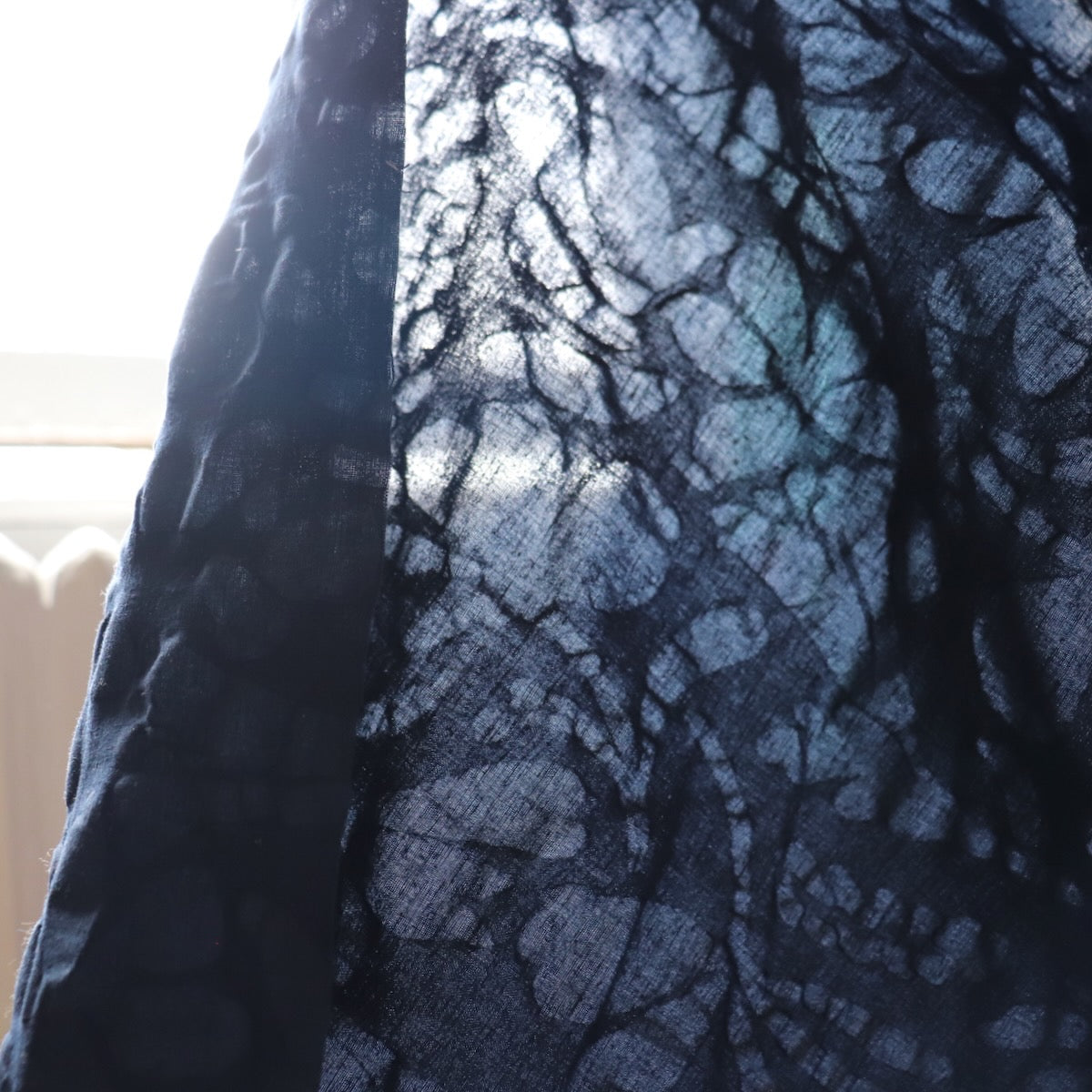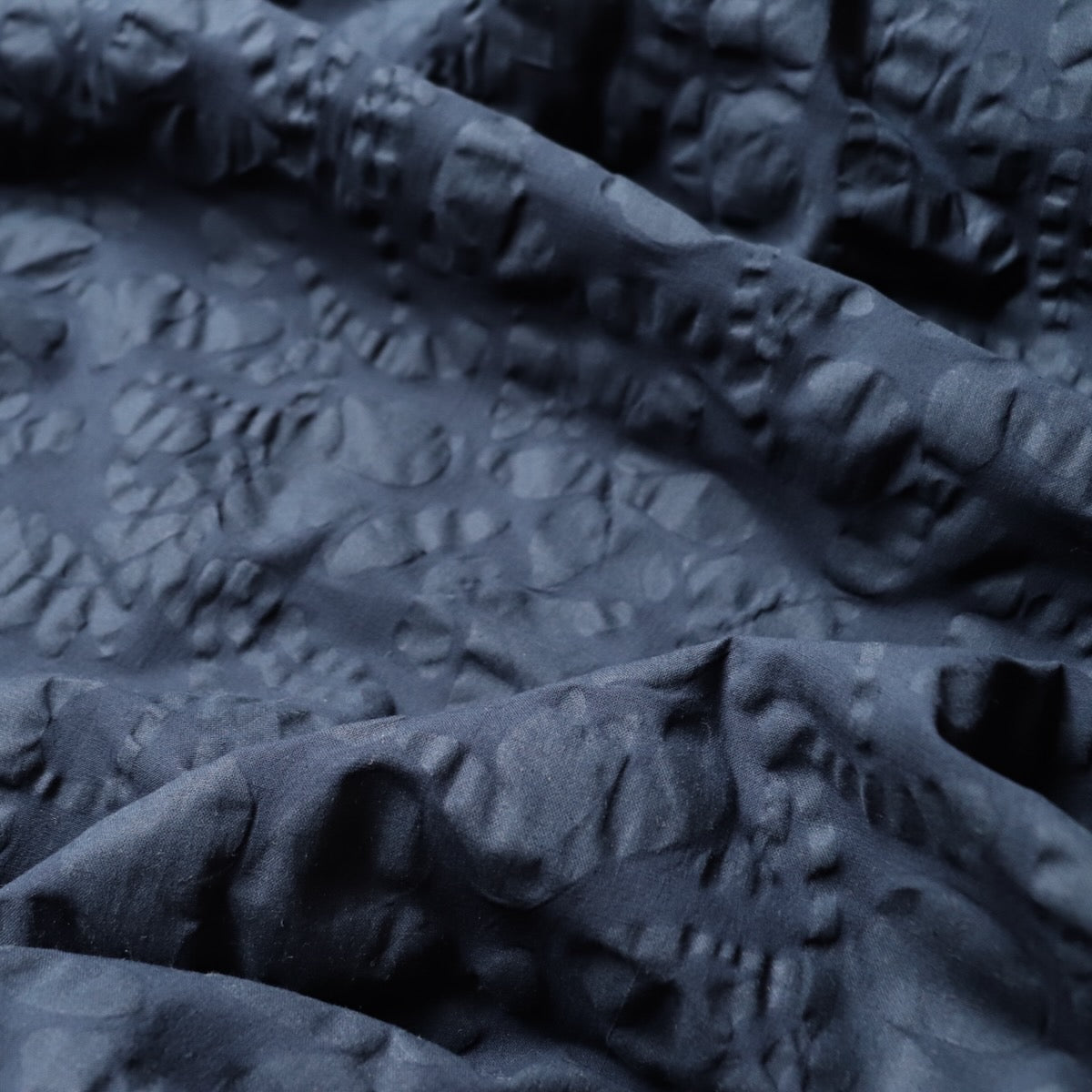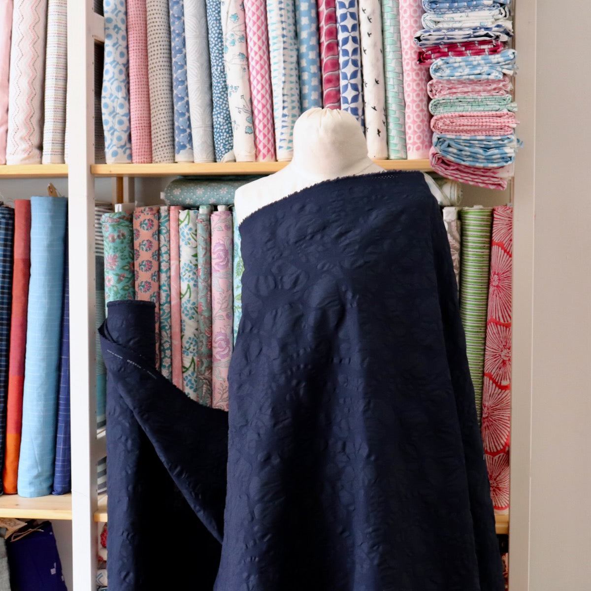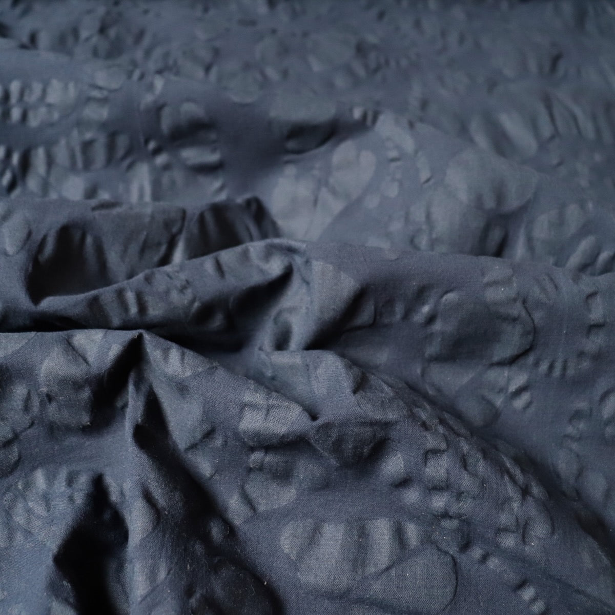 With an abstract floral-ish design made by the "salt shrink" method, this very unusual fabric is reminiscent of seersucker. In a true dark navy, it's a linen-cotton blend with a rather crisp body. The patterned areas are slightly translucent. Try it for a simple, structured top or dress such as the Capri pattern from Puff And Pencil, or an unlined lightweight jacket.