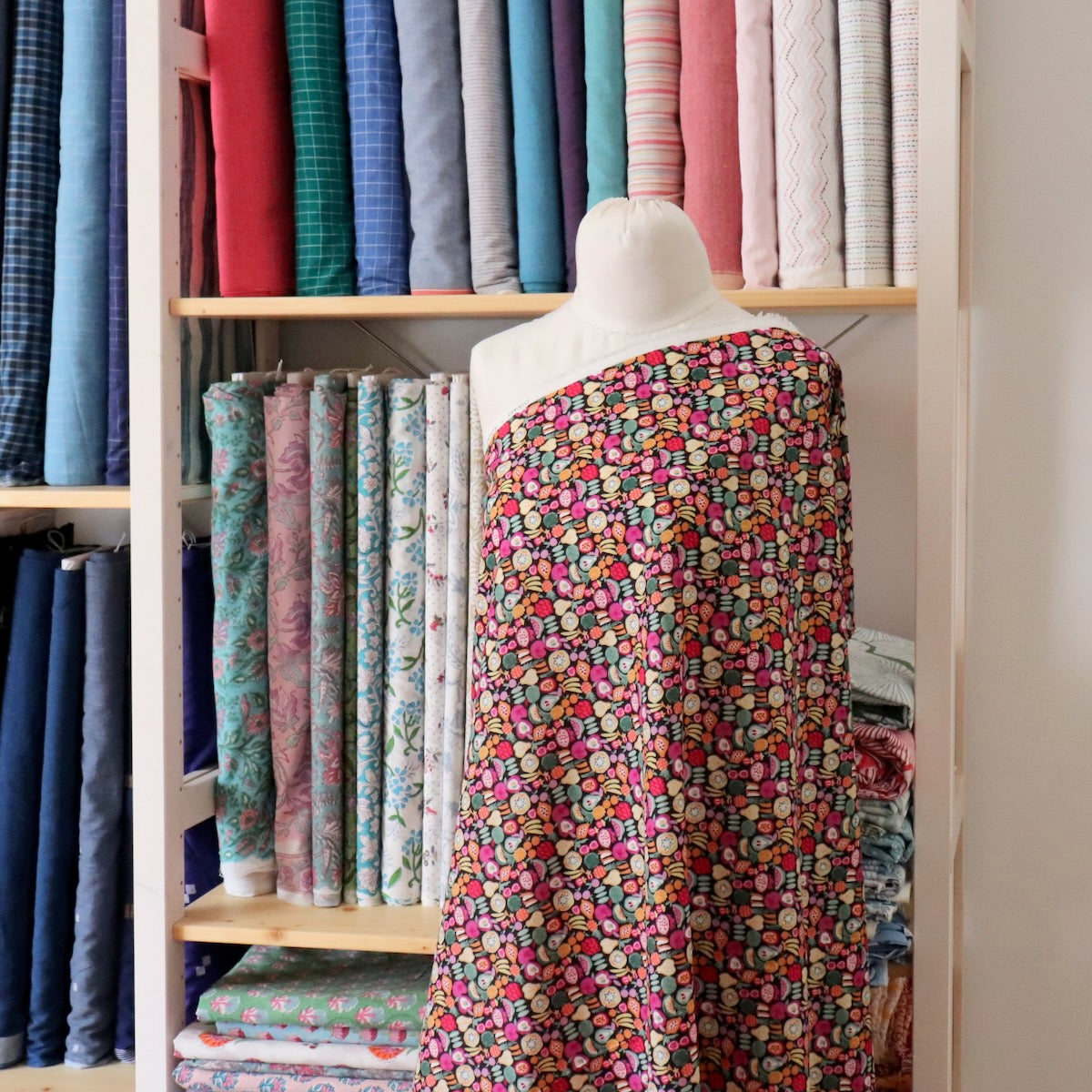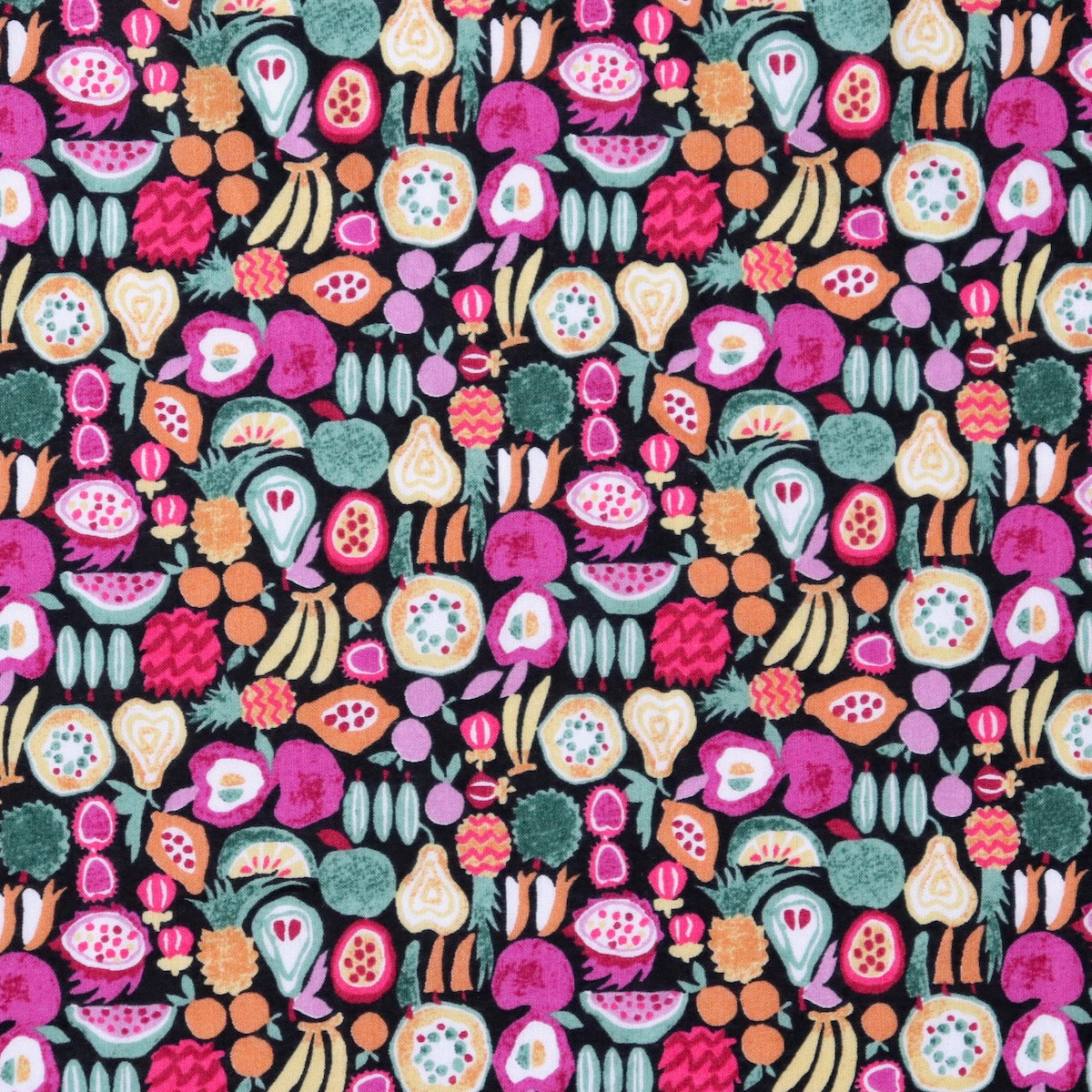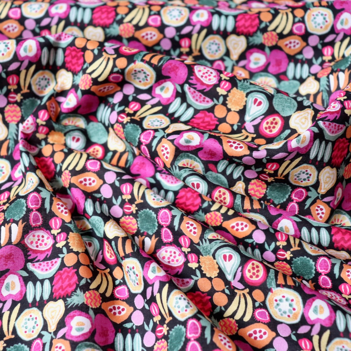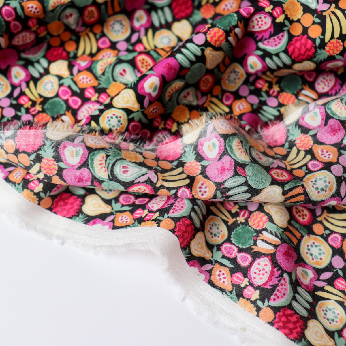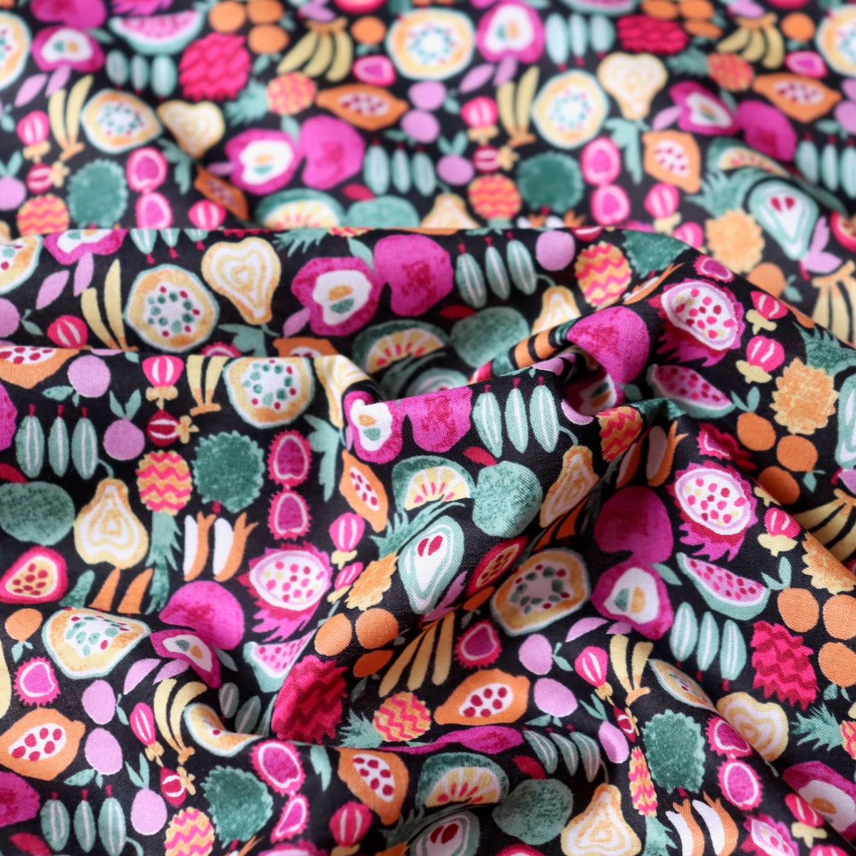 So much deliciousness! All the best fruits and veggies are here in vibrant pinks and greens on super fine black cotton lawn. Beautiful quality with a smooth silky touch which will be a dream to wear. Whatever you make is sure to bring a smile to all who see it, whether it's a novelty shirt or children's clothes. Watermelons measure about 3/4 inch wide.