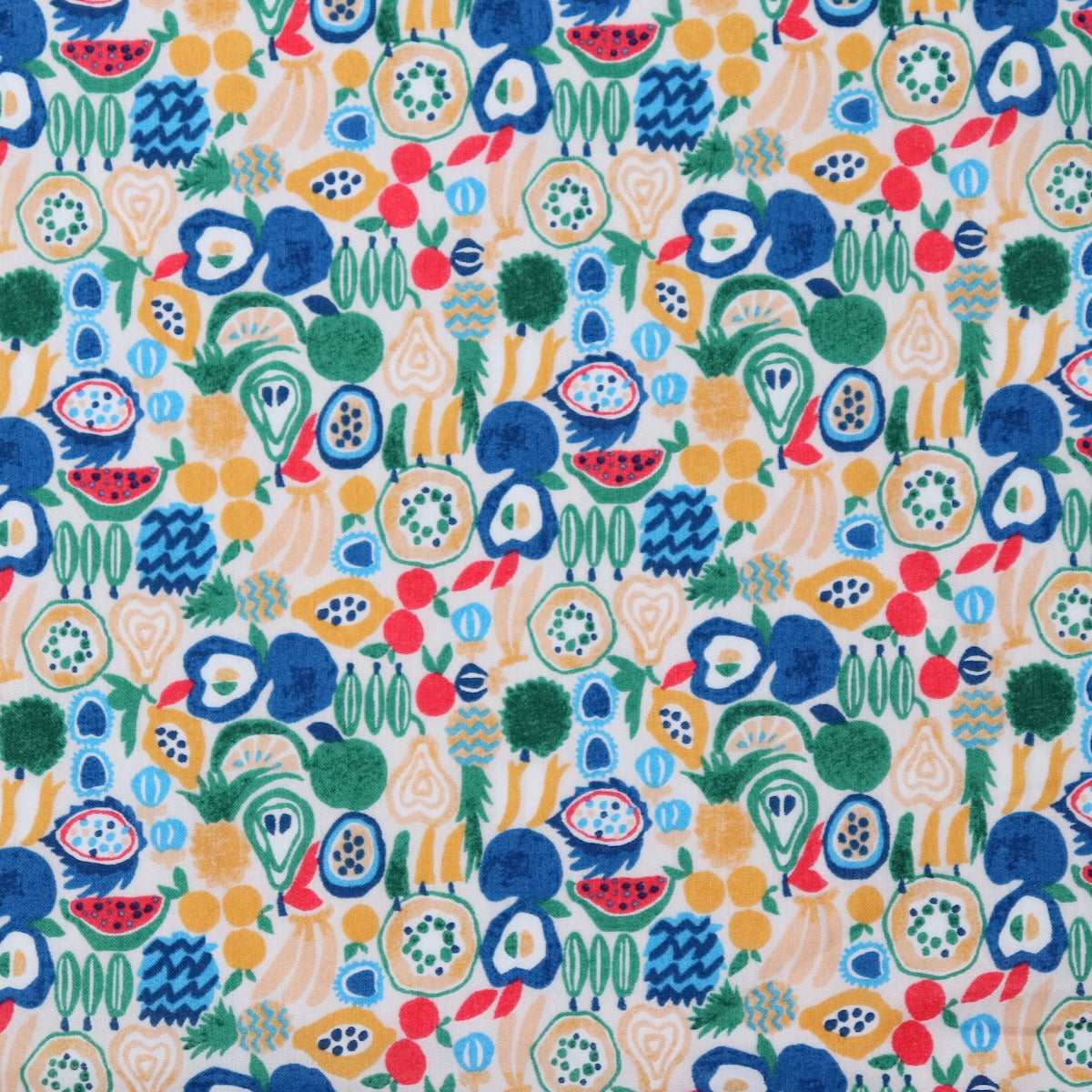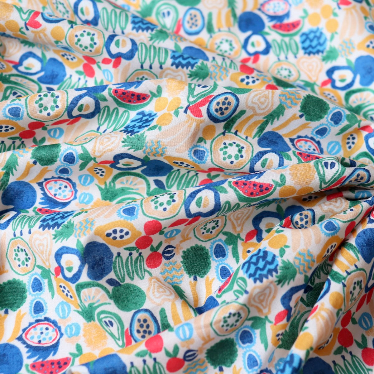 So much deliciousness! All the best fruits and veggies are here in bright primary colors on super fine off-white cotton lawn. Beautiful quality with a smooth silky touch which will be a dream to wear. Whatever you make is sure to bring a smile to all who see it, whether it's a novelty shirt or children's clothes. This fabric is slightly translucent and may need to be lined for some garments. Watermelons measure about 3/4 inch wide.