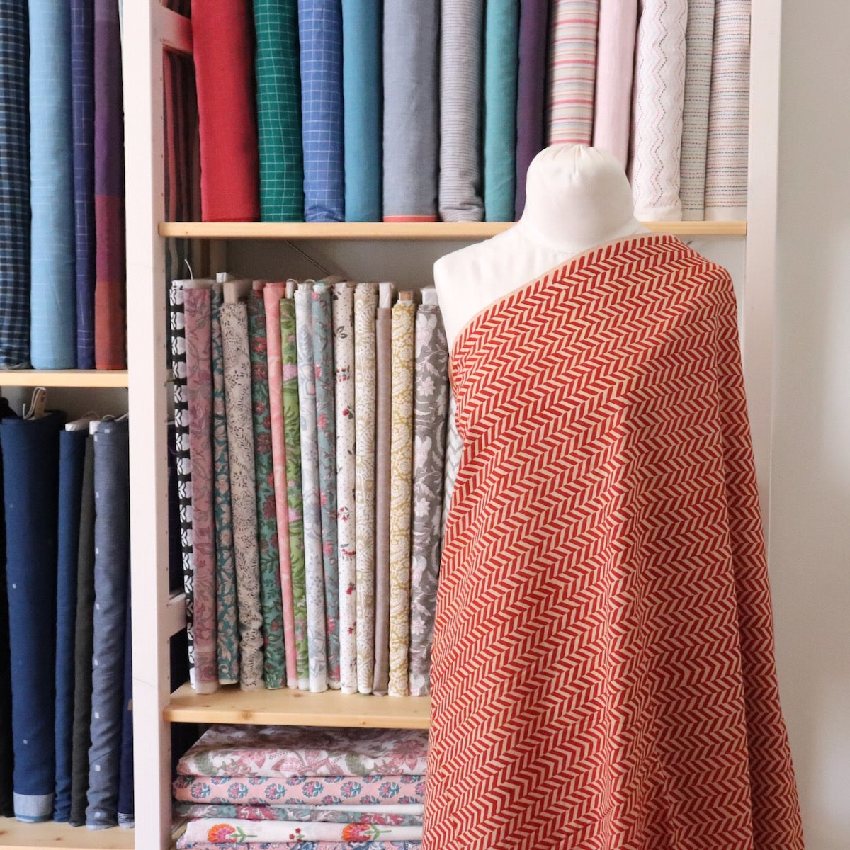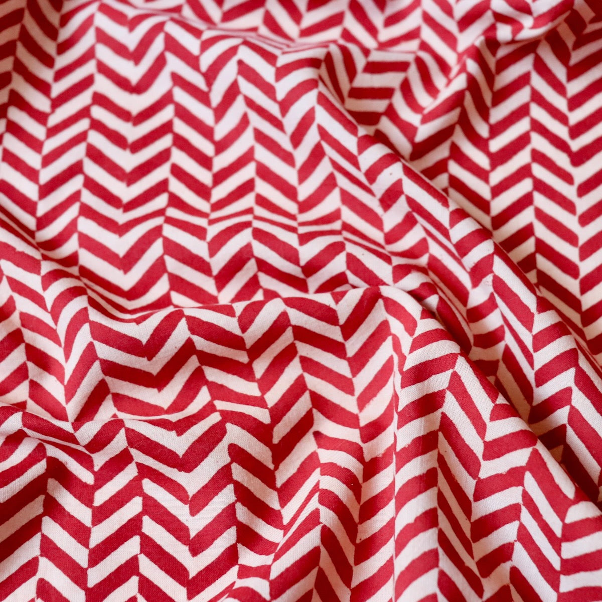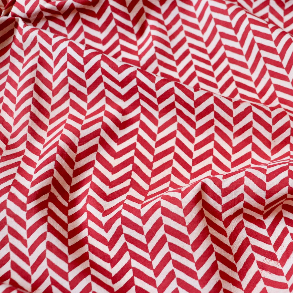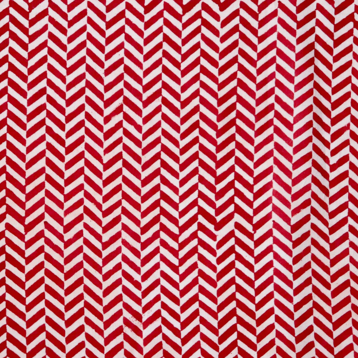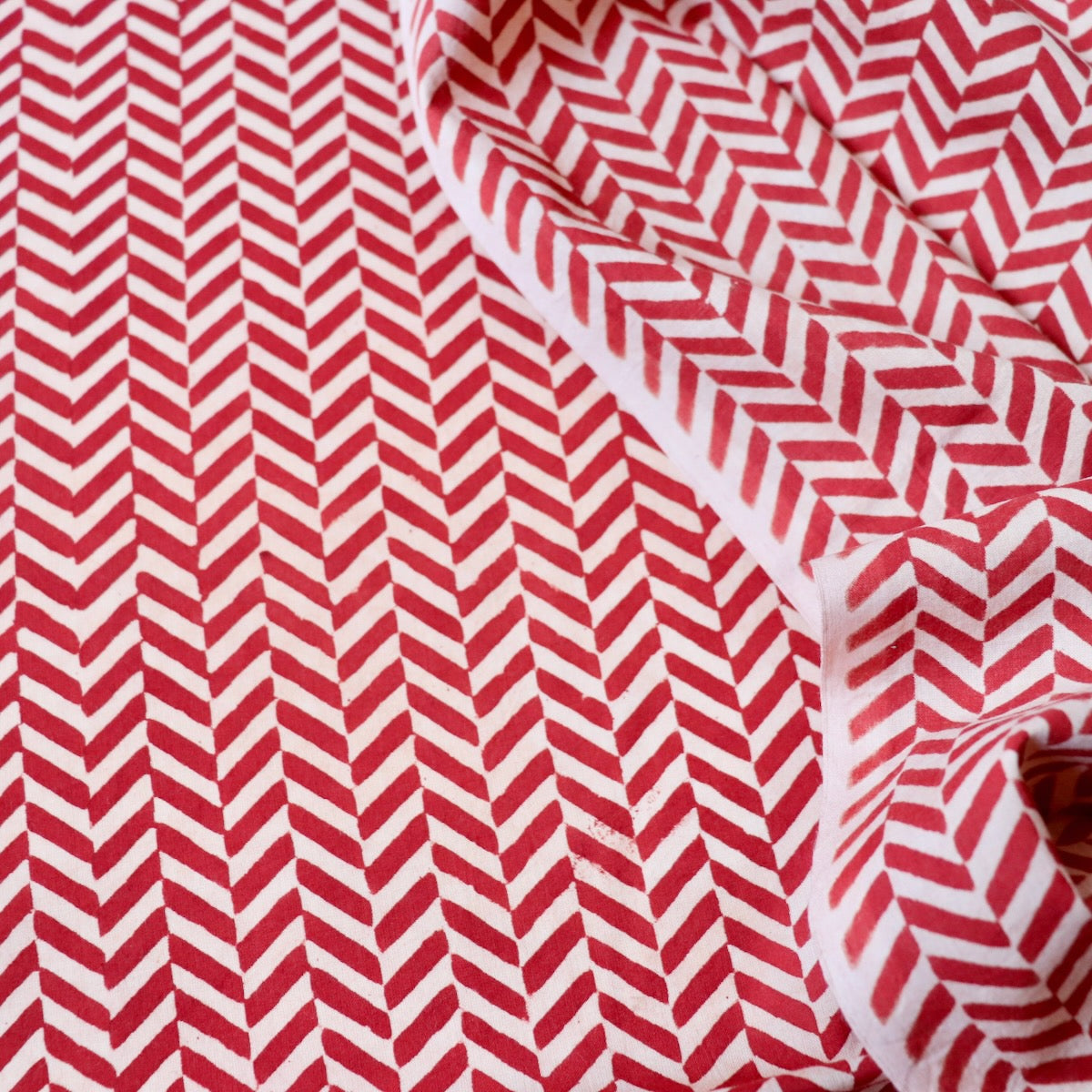Plaits of brick red on warm beige cotton, very soft. Herringbone stripes measure about an inch wide. Coordinates with Rusty Red Sprig and Chili Red Floral block prints.
