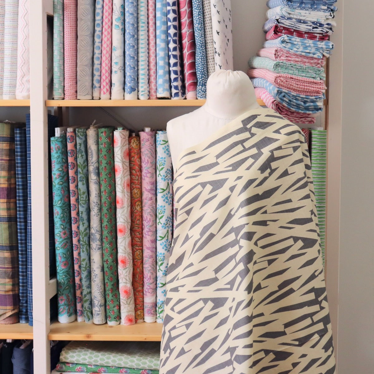 Streaks of warm ecru float on mid gray. Cotton dobby is a lighter mid-weight that's slightly crisp with a great woven texture. Perfect for heavier shirts, bottom pieces, or a light topper like the Naïma Jacket from Coralie Bijasson. Lines measure about 1/2 inch wide.