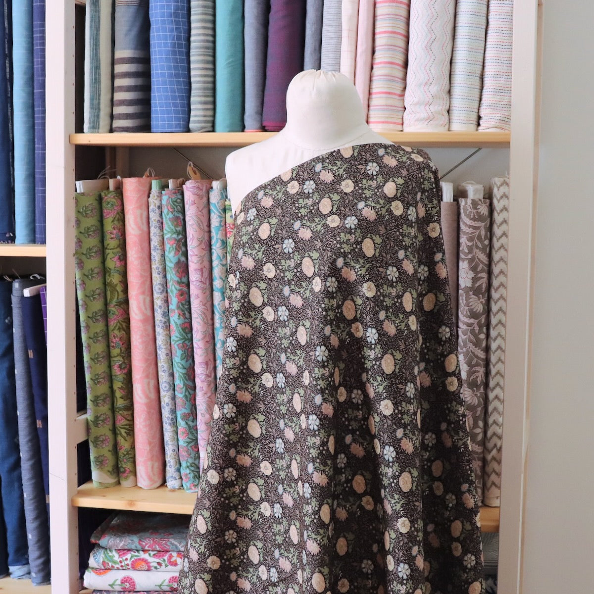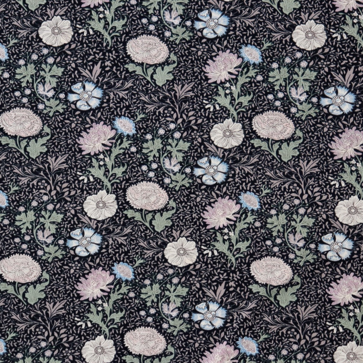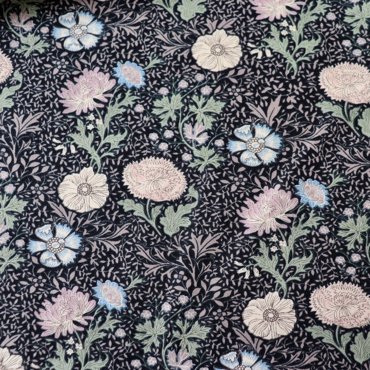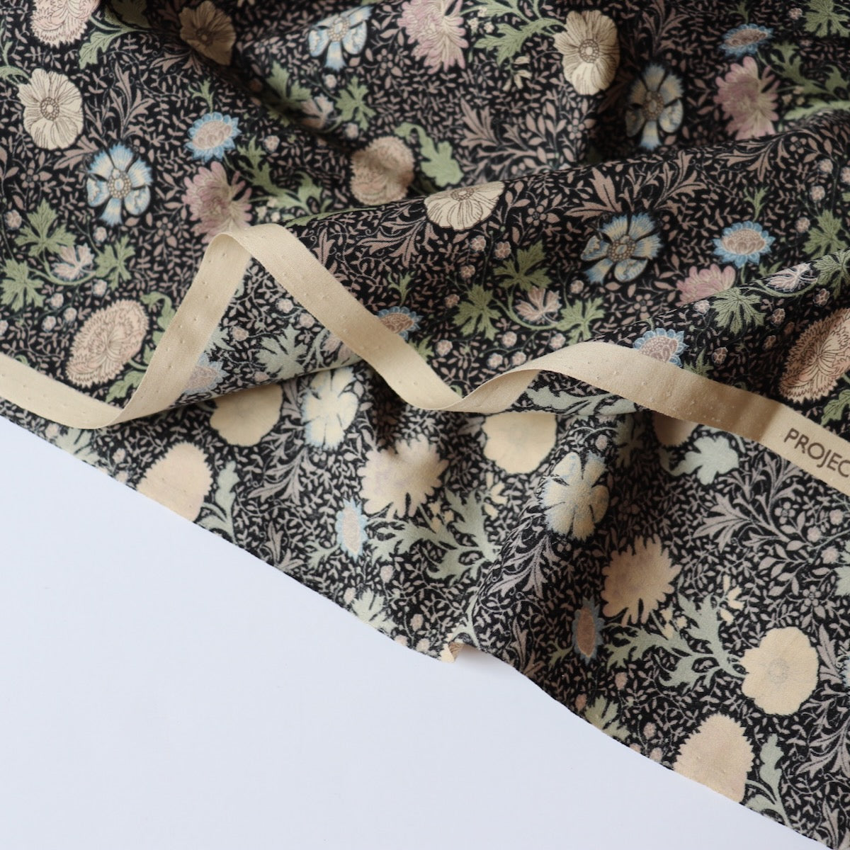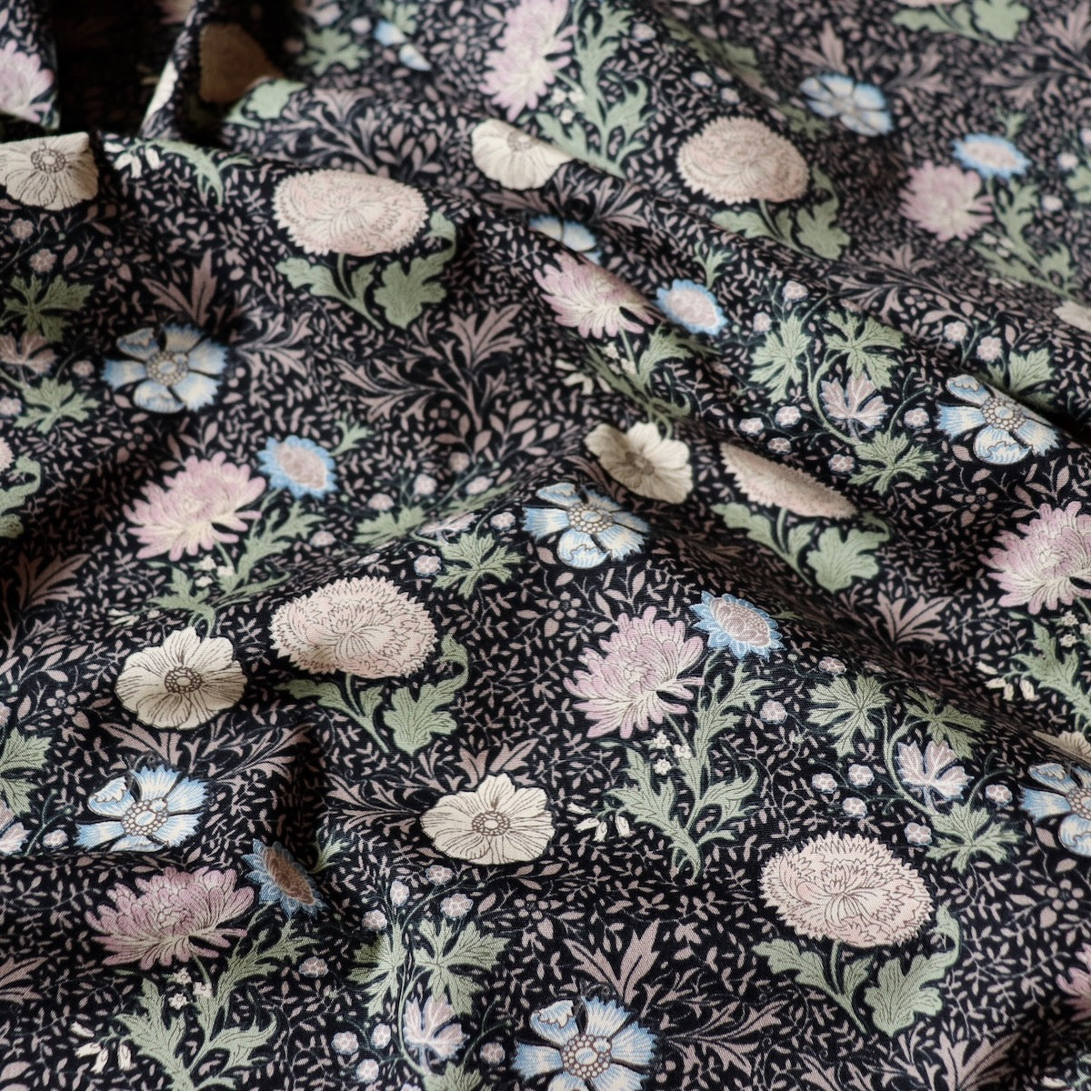 Pale Pre-Raphaelite flowers strewn on jet black. The cotton sheeting is smooth to the touch, slightly heavier than the average shirting fabric and of a finer quality than traditional quilting cotton. Perfect for home decor as well as garments. Flowers measure about one inch wide.