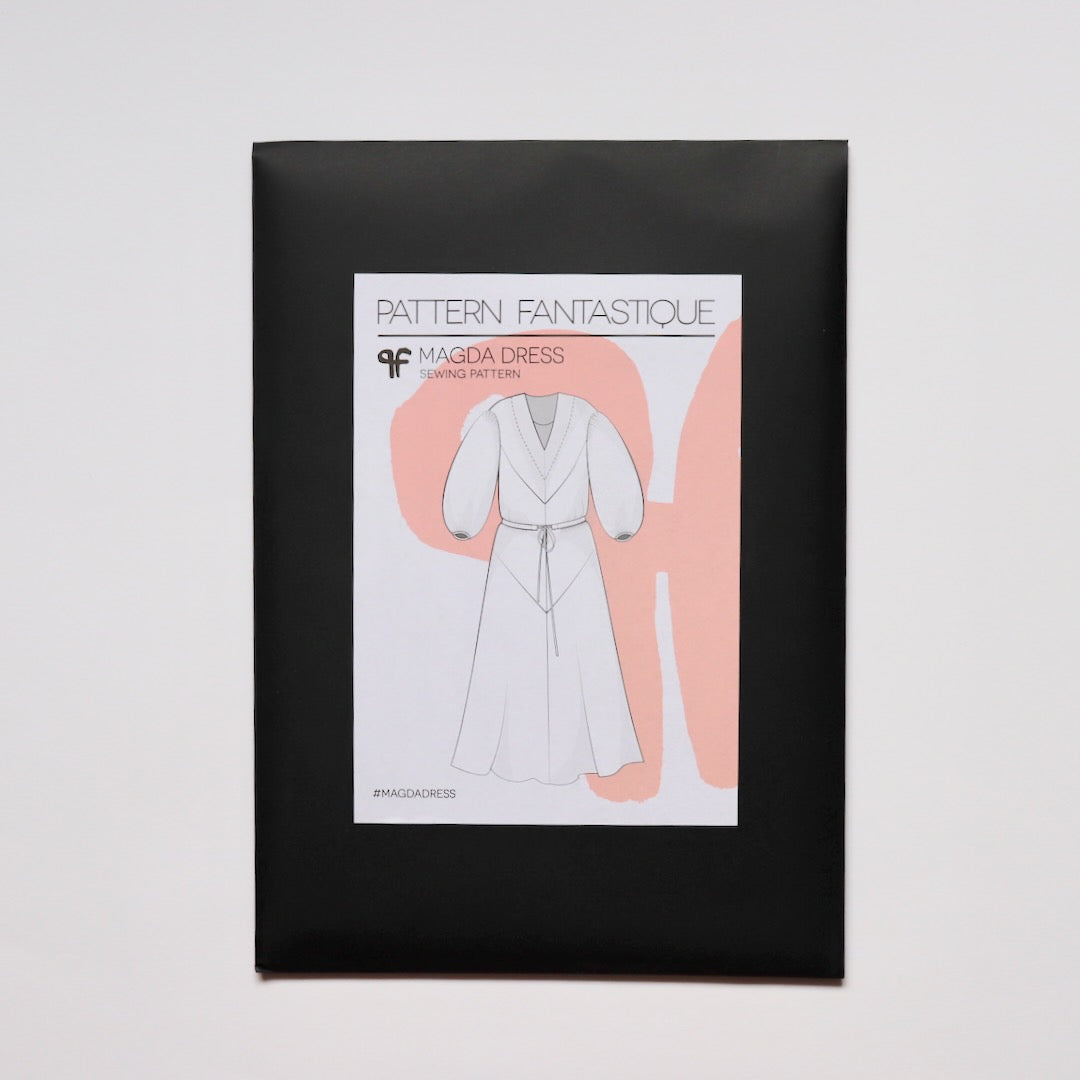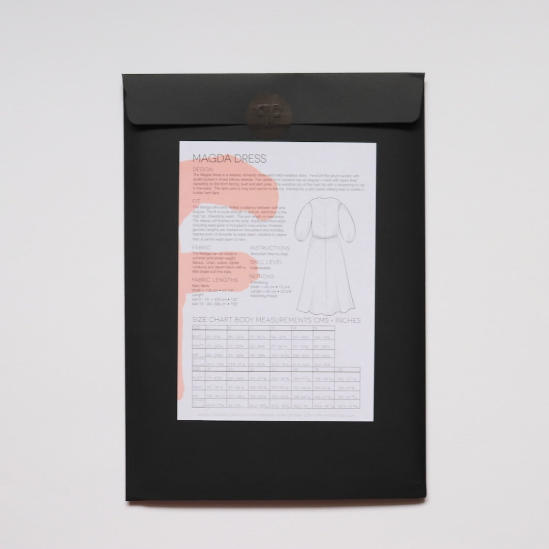 The Magda dress is a relaxed, romantic dress with mild medieval vibes. Fend off the witch hunters with spells tucked in those billowy sleeves. The centre front neckline has an angular V-neck with seam lines repeating on the front-facing, bust and skirt yoke. The waistline sits at the high hip with a drawstring to nip in the waist. The skirt yoke is long and narrow to the hip, followed by a skirt panel utilising bias to create a bolder hem flare.
