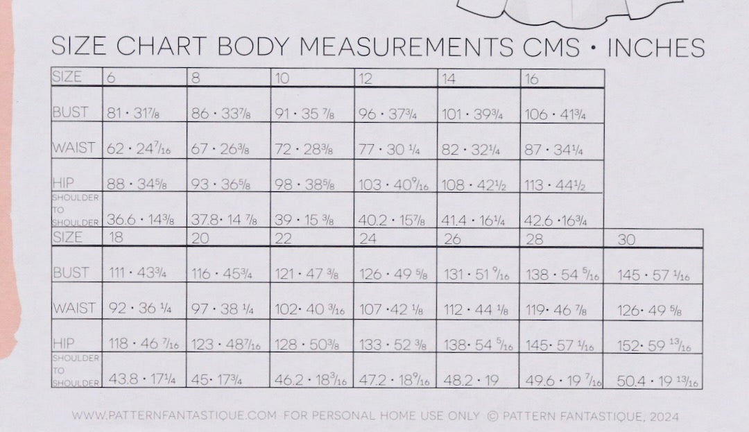 The amount of ease does give sizing some wriggle room. Provided in the instructions and pattern are finished measurements, including bodice, sleeve & sleeve lengths and ease provided at the bust, true waist, hip and high hip waist seam.