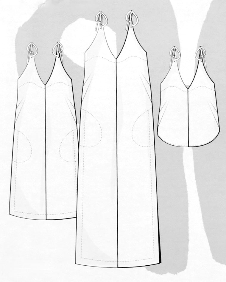 The Teia (Tey-A) dress & cami is a loose shift that can be worn as a simple dress or pinafore over a blouse. Utilitarian finishes include deep facings, mitred cornered hems and side splits. Topstitching to enhance the style lines. Optional pockets and striking long stretched out straps for a vampy finish on an otherwise easy wearing dress.