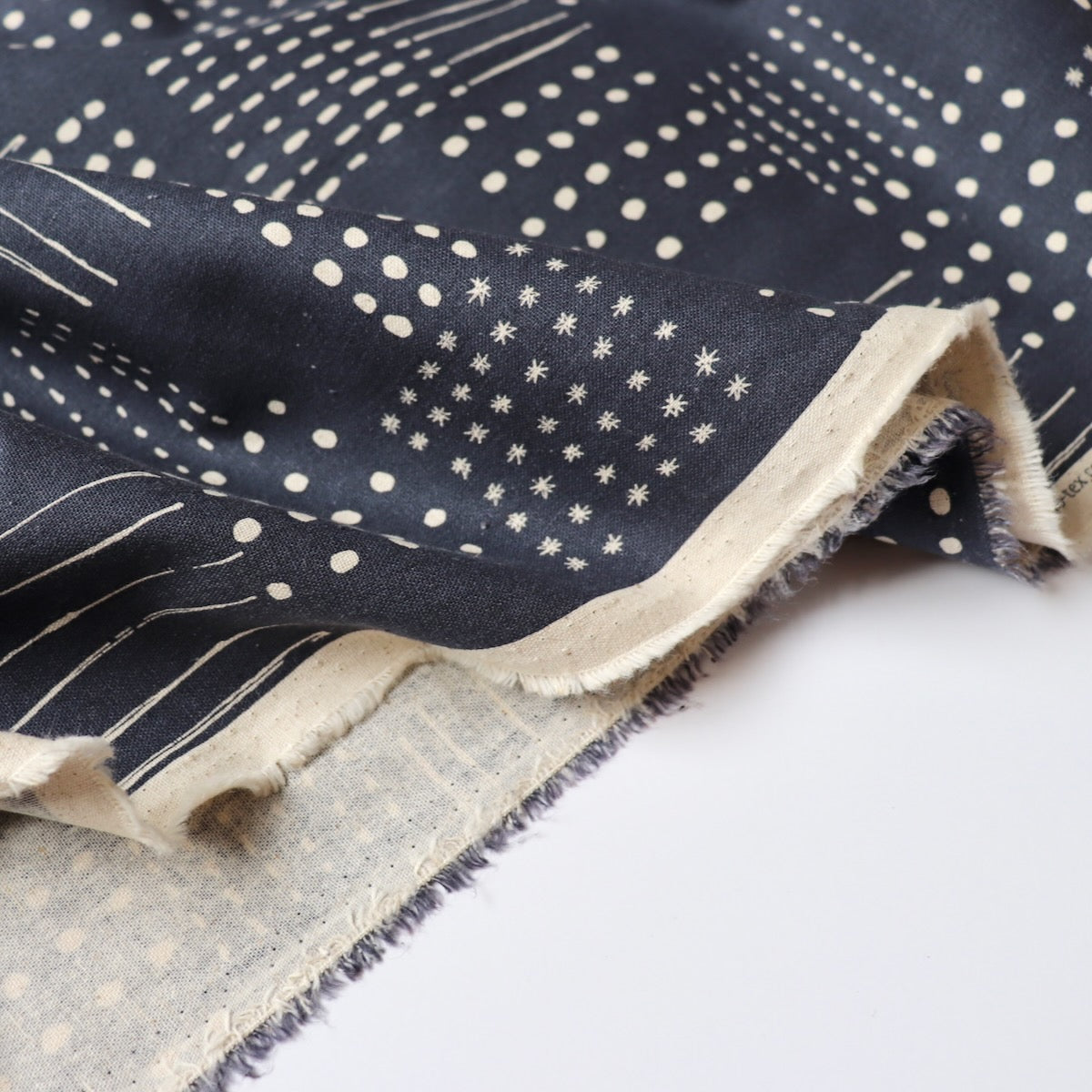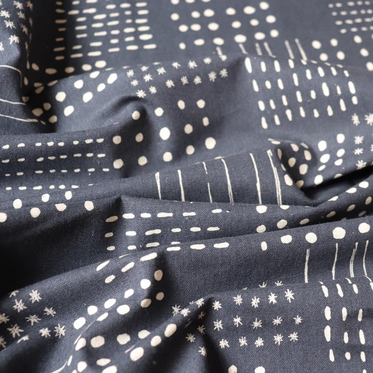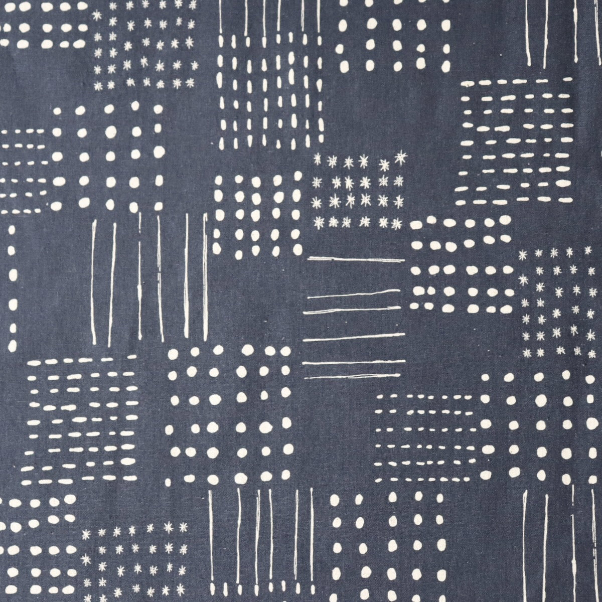 With a sketchy hand-drawn look, this light canvas will make cool jackets, trousers, and bags. Graphite blue on a natural flax-colored base. It's substantial, due to the hint of linen, but not at all stiff. Squares measure 2 to 3 inches wide.