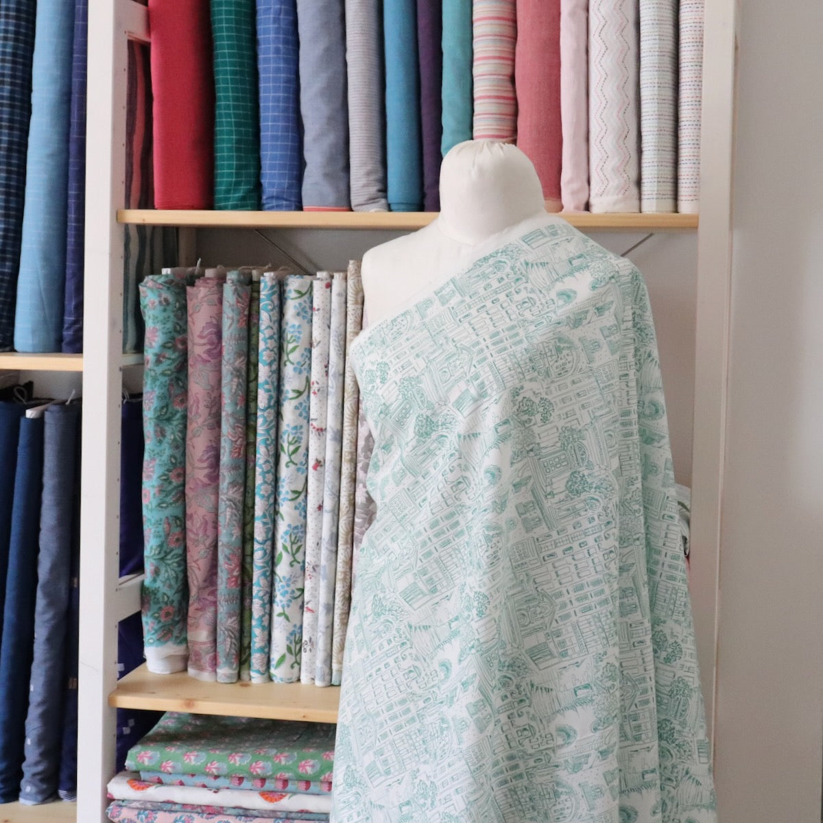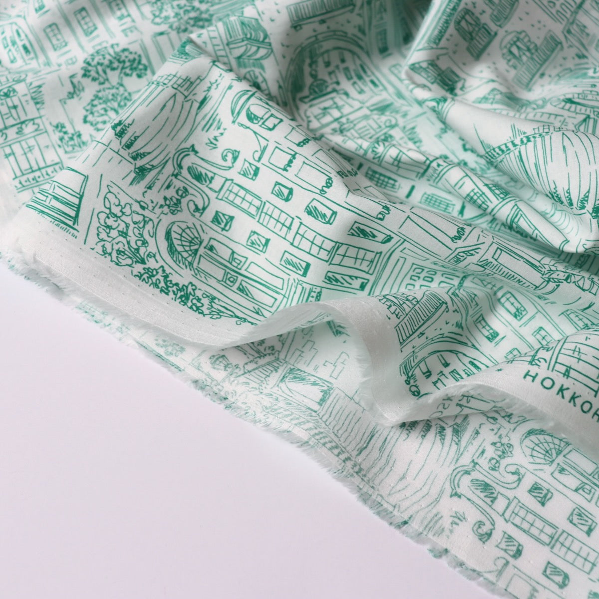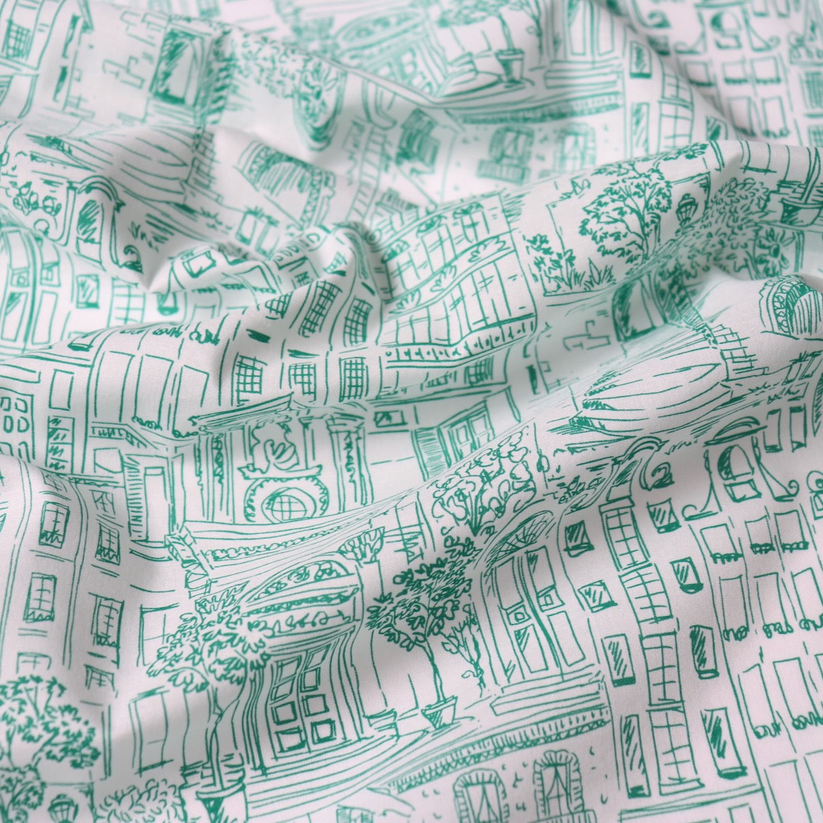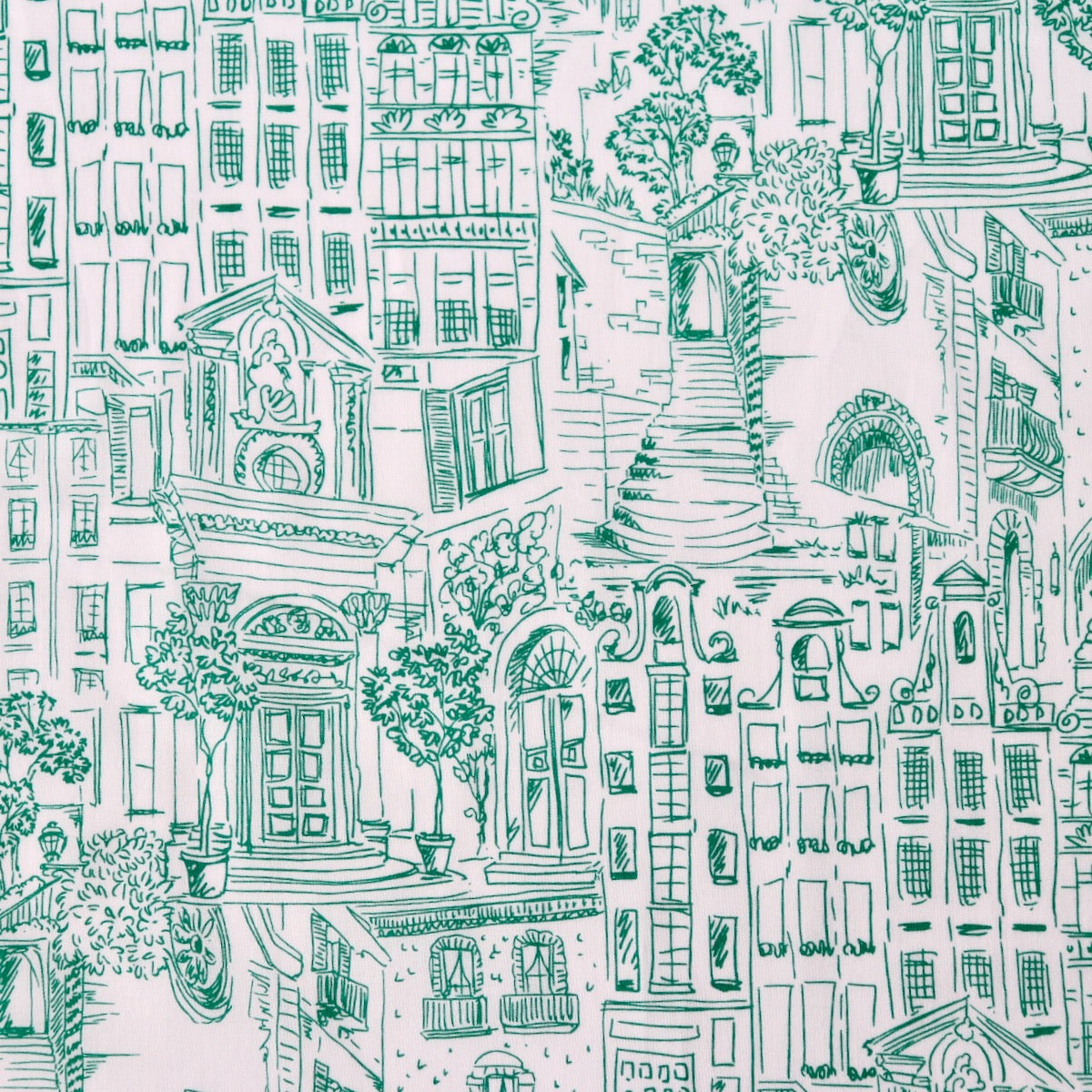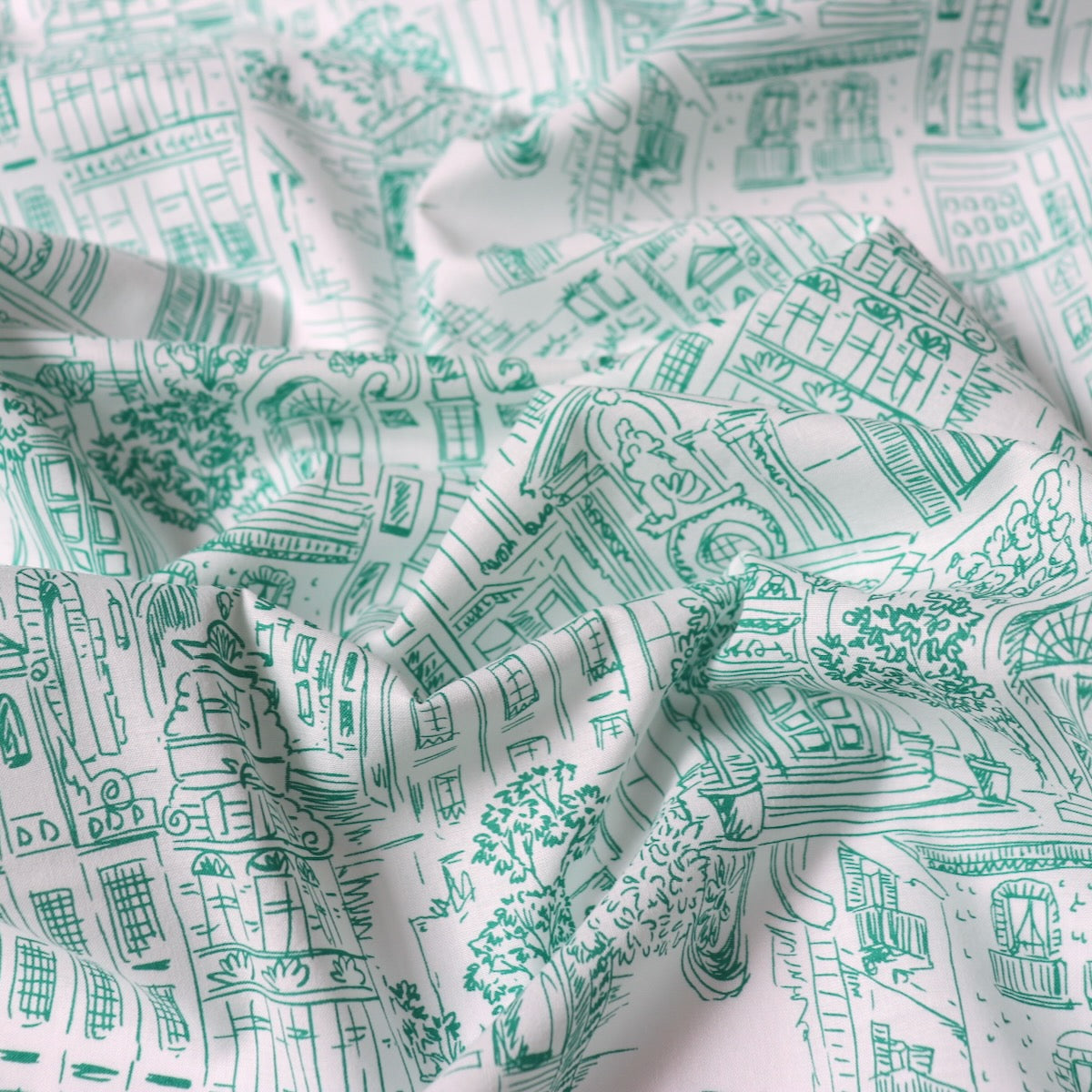 Bits and pieces of Old World architecture all jumbled together, like a memory of holidays past. Emerald green on super fine off-white cotton lawn. Beautiful quality with a smooth silky touch which will be a dream to wear. This fabric is slightly translucent and may need to be lined for some garments. Pair it with the Gisela Dress pattern from Ellie & Mac. Repeat measures about 12 inches wide.