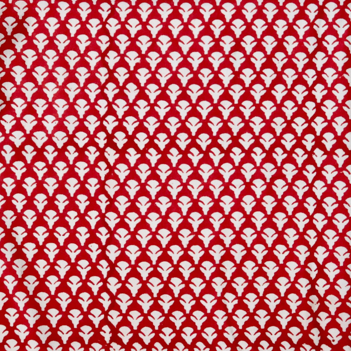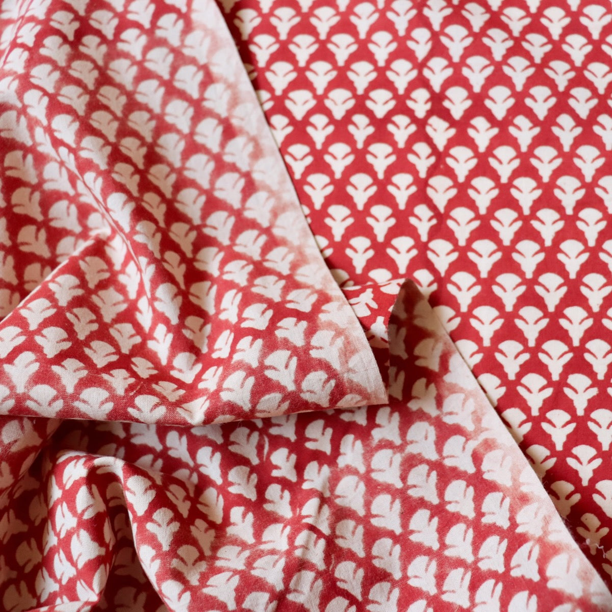 Tiny sprigs all lined up, warm beige on brick red. Hand printed on very soft cotton. Florets measure about a half inch. Coordinates with Herringbone and Chili Red Floral block prints.