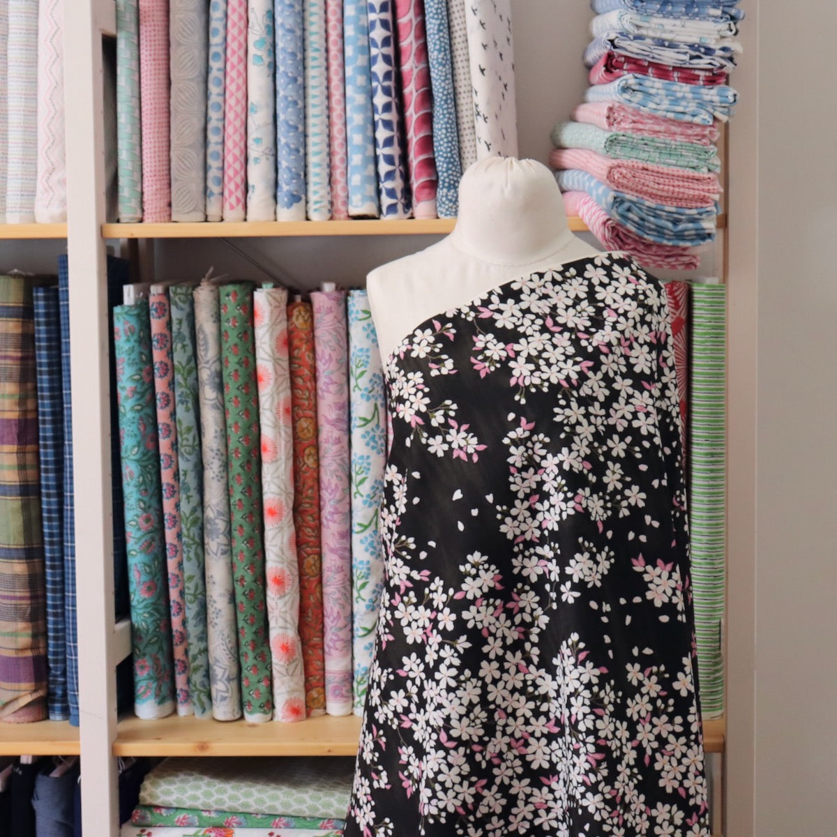 Cherry blossoms drift against a wash of gentle black. A classic Japanese print on ecru cotton dobby, a mid-weight textured weave with a softly crisp drape that's reminiscent of shantung. Perfect for a boxy shirt, pleated skirt, and bags and home decor. Blossoms measure about one inch wide. Absolutely gorgeous.