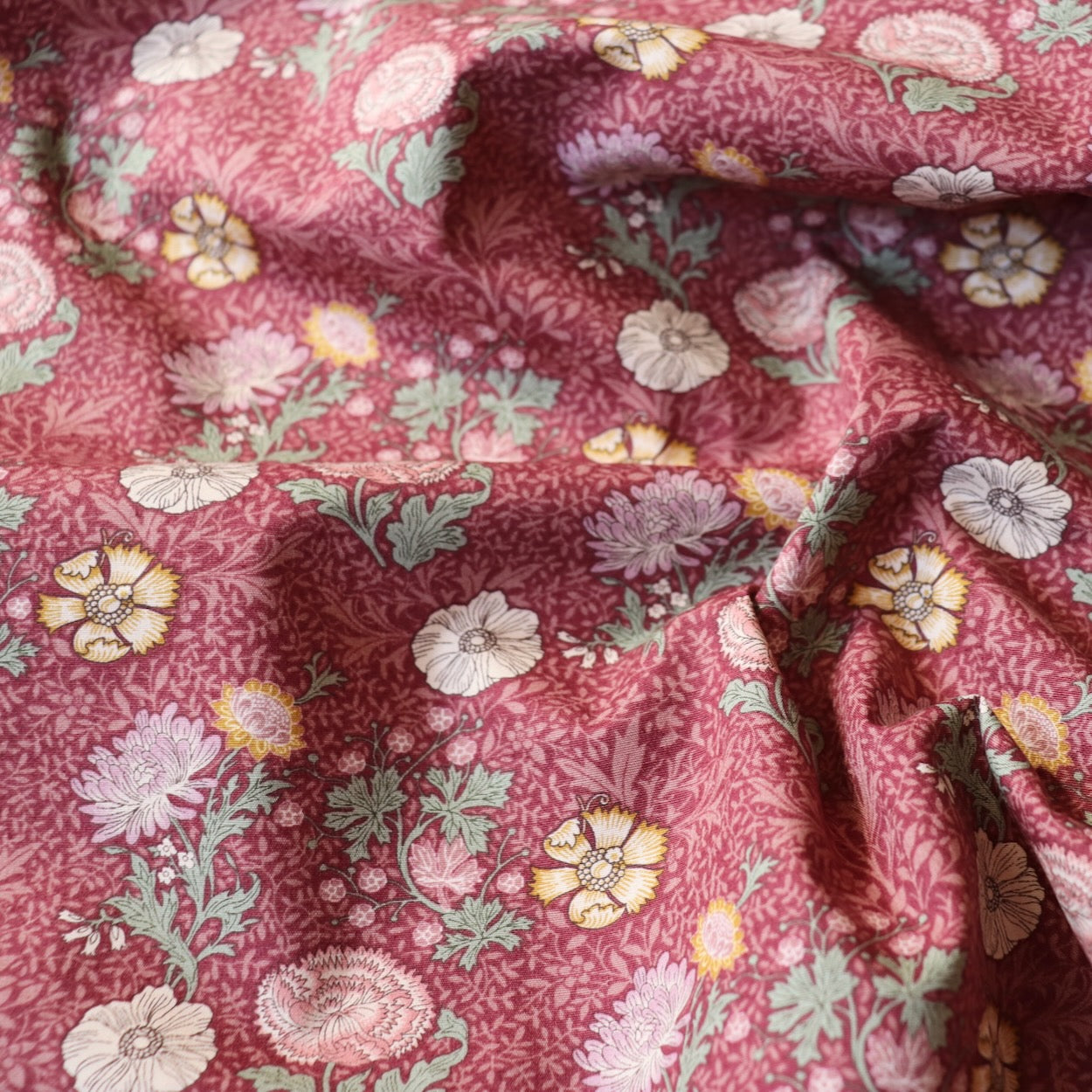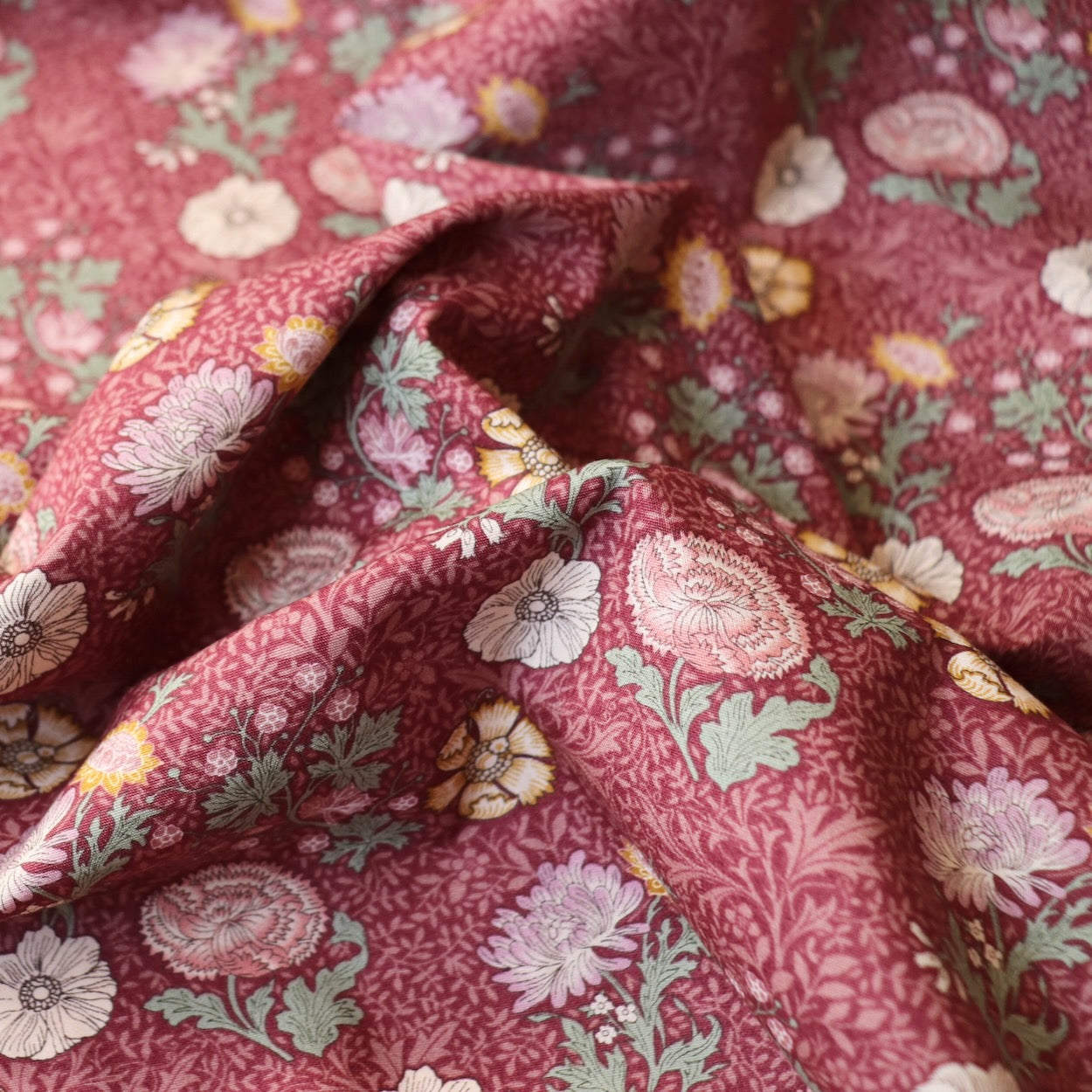 Pre-Raphaelite flowers strewn on a lush berry-red background. The cotton sheeting is smooth to the touch, slightly heavier than the average shirting fabric and of a finer quality than traditional quilting cotton. Perfect for home decor as well as garments. Flowers measure about one inch wide.