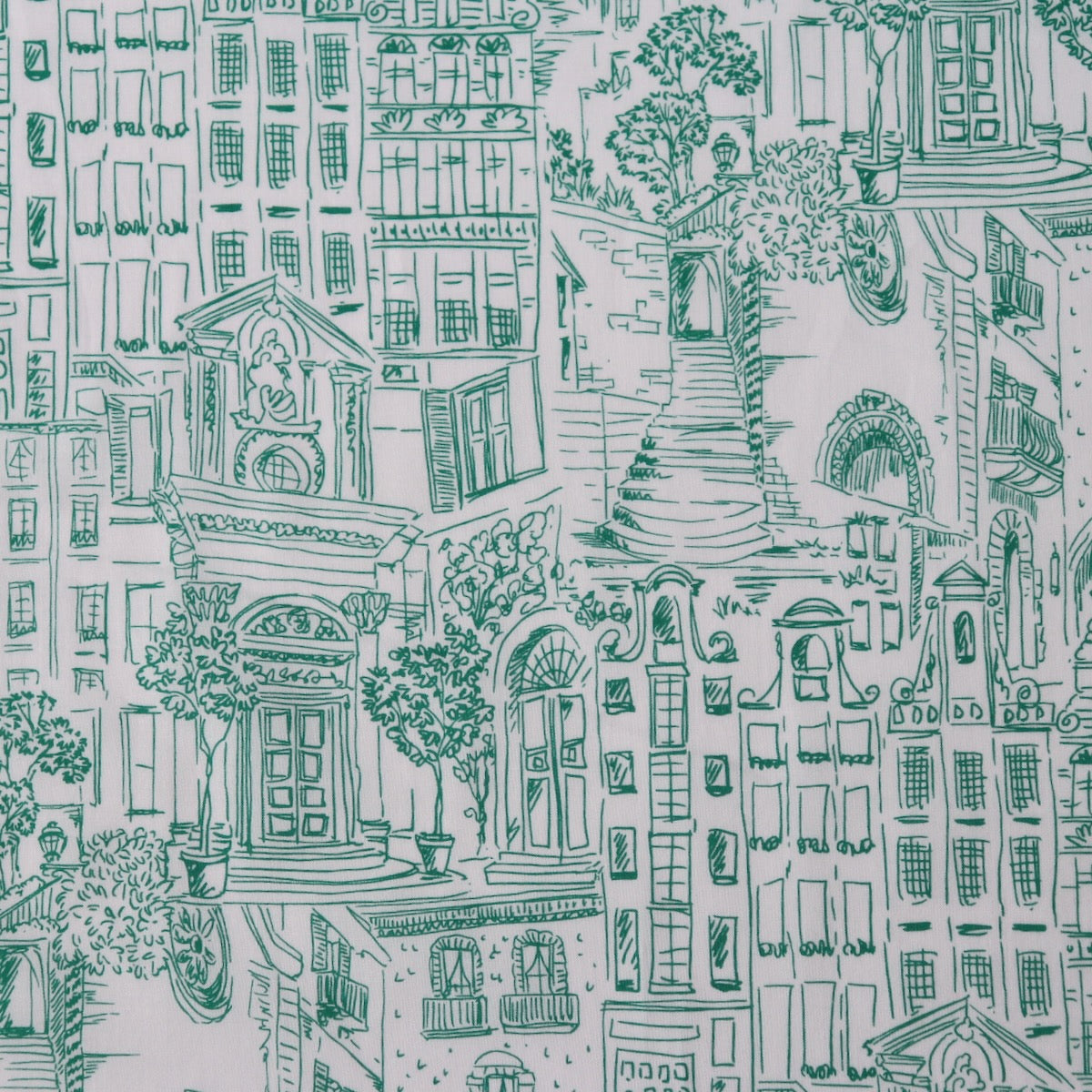 Bits and pieces of architectural delights all jumbled together, like a memory of holidays past. Emerald green on super fine off-white cotton lawn. Beautiful quality with a smooth silky touch which will be a dream to wear. This fabric is slightly translucent and may need to be lined for some garments. Sew a soft V-Neck Cuff Top from The Assembly Line.