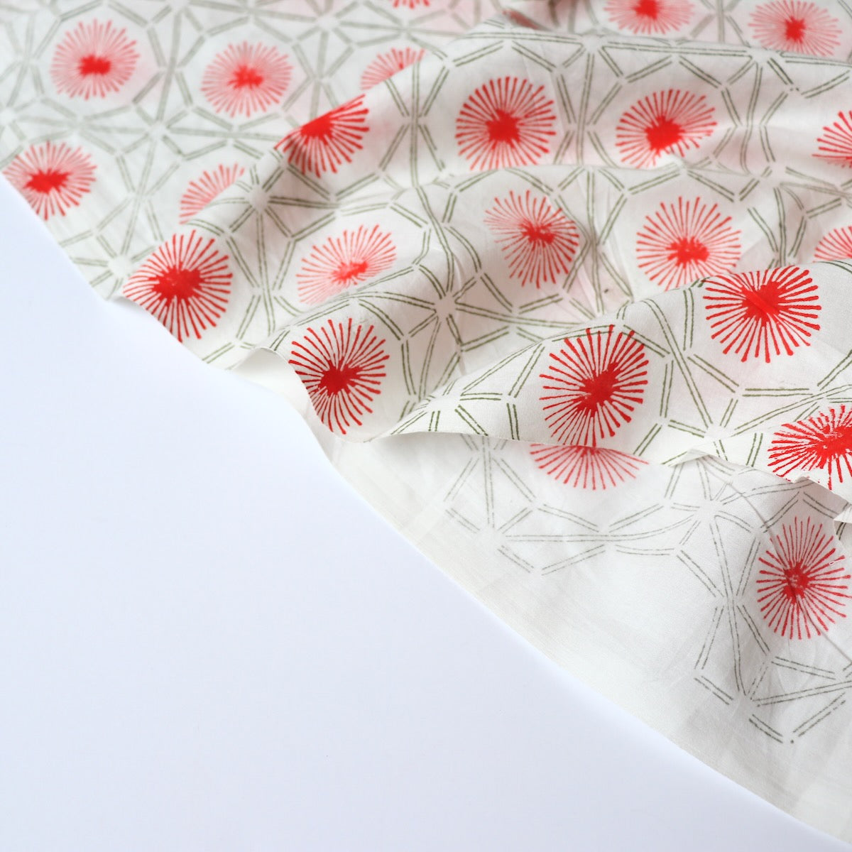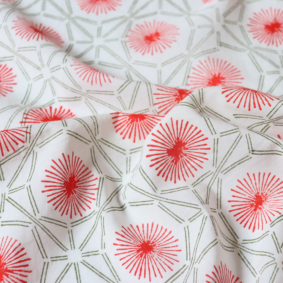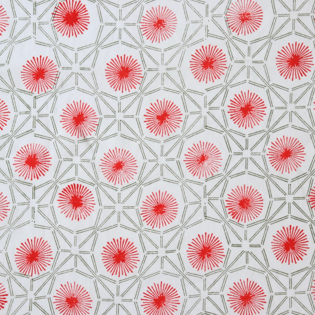 Bursts of bright red-orange float against an airy geometric lattice of olive green. Hand printed on very soft white cotton. Stars measure about 1.5 inch wide.