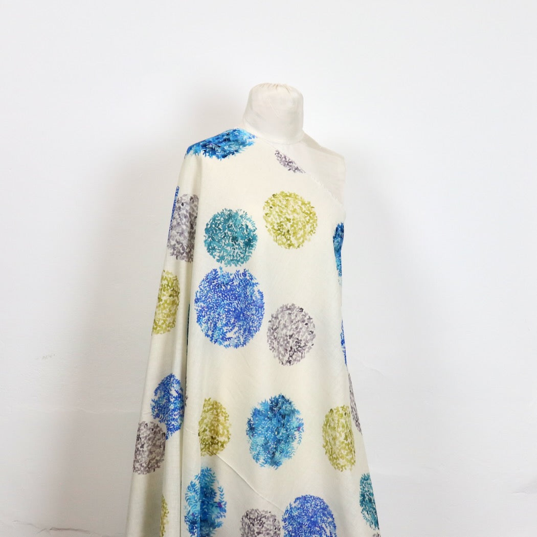 Colorful flower bombs on fine cotton/linen. The rather transparent voile has a hint of linen in the color and texture. Perfect for soft, floaty dresses and tops or the most ethereal curtains. Make a Verona Top from StyleArc, or any pattern with softly gathered fullness. (Most garments will need to be lined or layered.)
